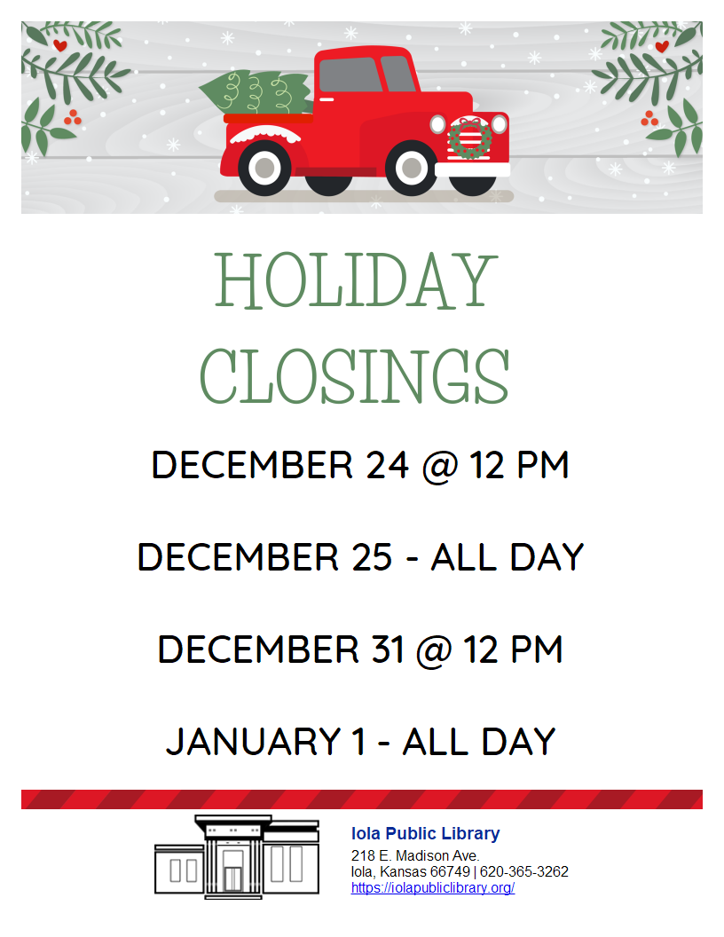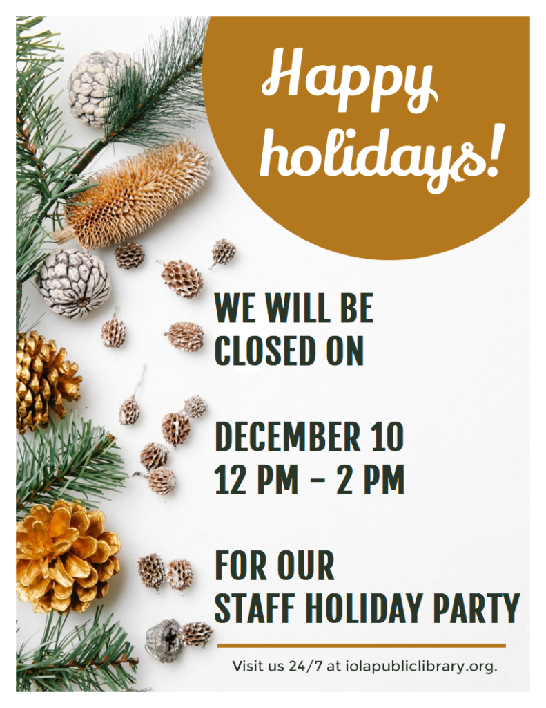 - Wednesday, Dec. 10: We will CLOSE from 12-2 pm for our Staff Holiday Party.