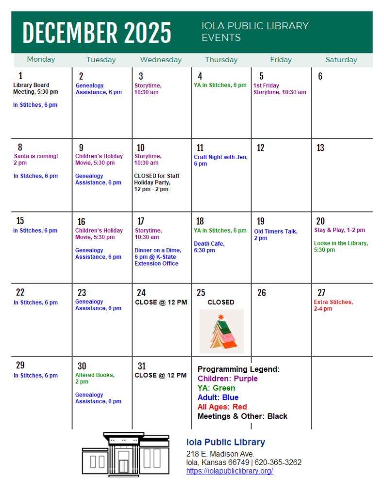 - Thursday, Dec. 18: Death Cafe is at 6:30 pm. Come have honest conversations about death over coffee, tea, and treats. This is not a therapy or support group, but everyone can openly share. This is a safe, welcoming space to listen, connect, reflect, and share a laugh or two!