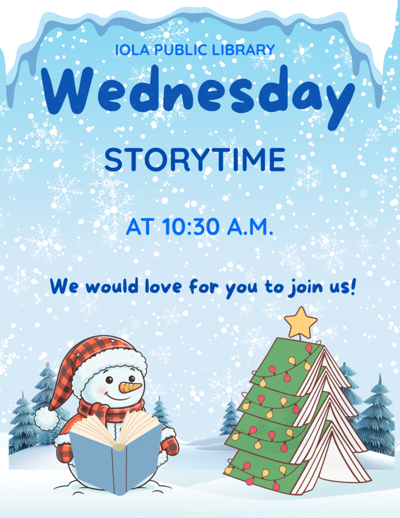 - Storytimes with Ms. Lesa on Wednesday mornings at 10:30 am, Dec. 3, Dec. 10, and Dec. 17.