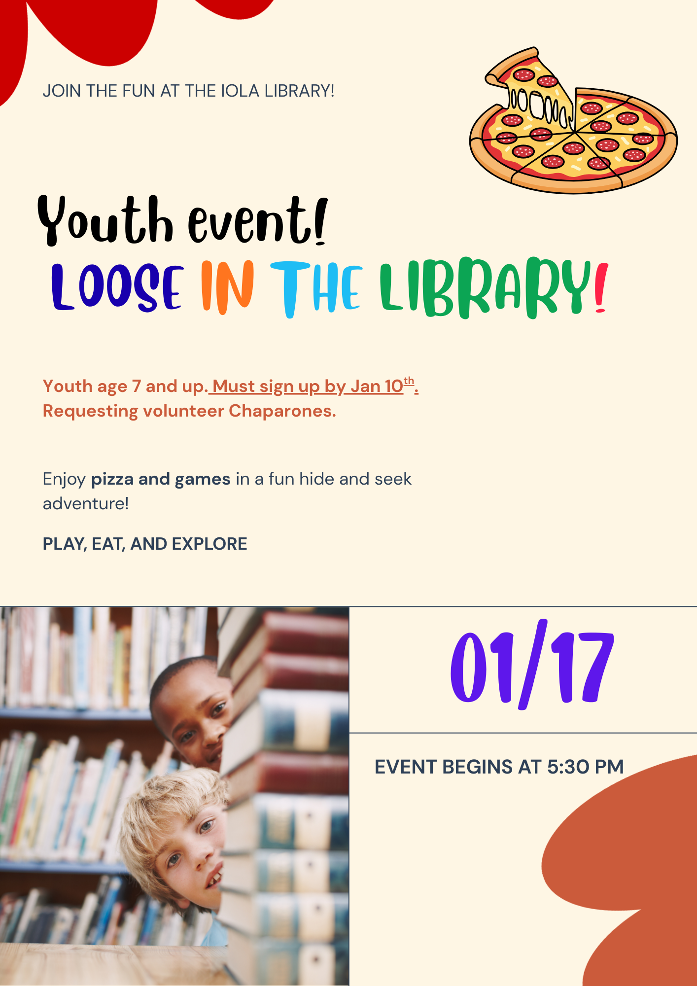 - Jan. 17 at 5:30 pm: Loose in the Library, register at the library by Jan. 10
