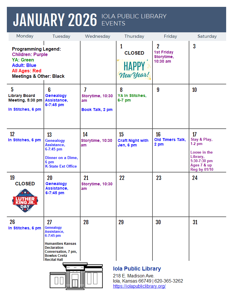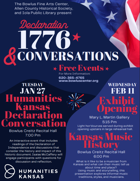 - Tuesday, Jan. 27: Humanities Kansas Declaration Conversation with Isaias J. McCaffery is at 7 pm in the Bowlus Creitz Recital Hall. The event is brought to you by The Bowlus Fine Arts Center, Allen County Historical Society, and Iola Public Library.